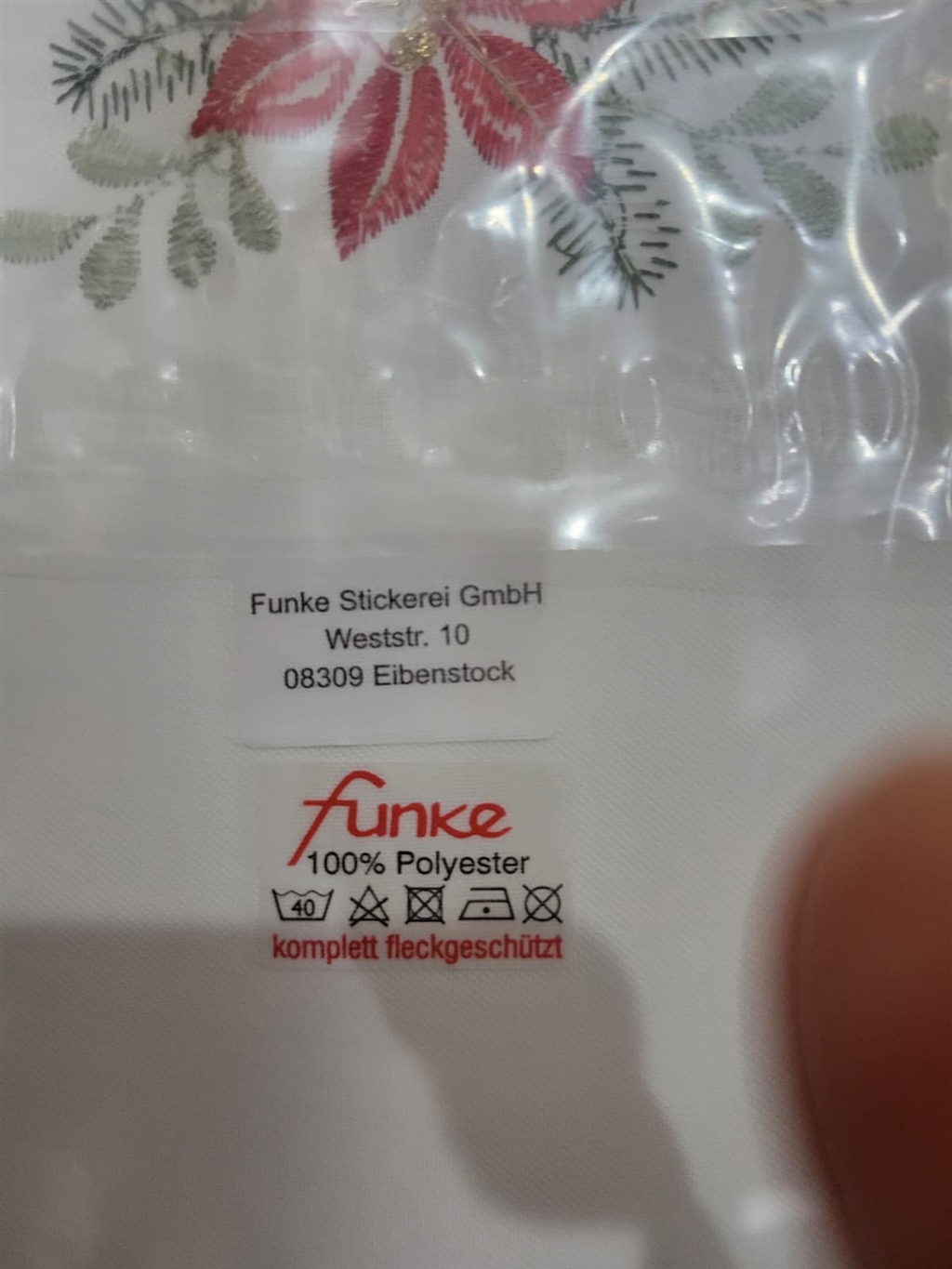 is this 100% cotton or linen? Is there any polyester in this table runner? Linen Table Runner - White with Poinsettias, Leaves & Stars – Large